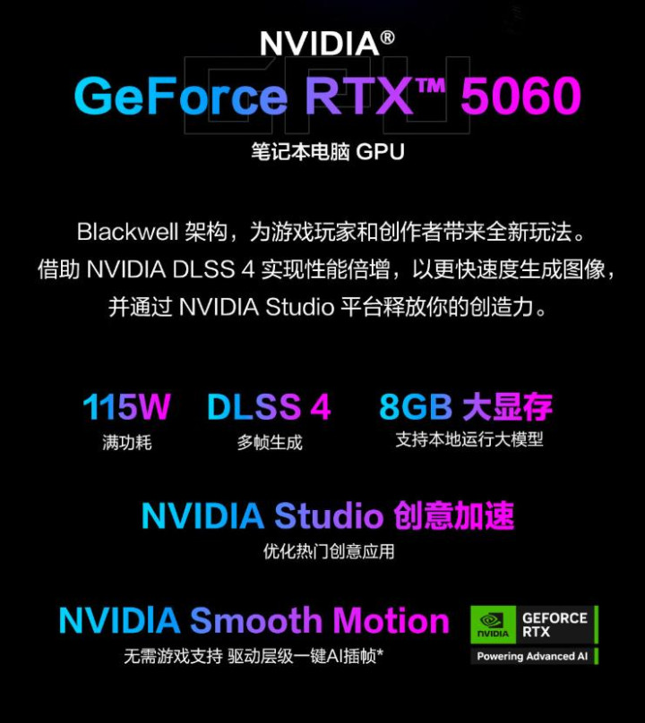 在核心配置上,ROG魔霸新锐 2025搭载了NVIDIA® GeForce RTX™ 5060笔记本电脑GPU,作为甜品级的重磅升级,它带来了Blackwell 架构和DLSS 4,为所有玩家带来升级体验。同时还集成本地 SLM 的应用,加速运行。