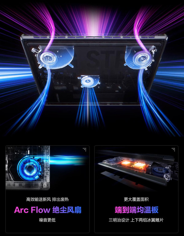 除了强大的NVIDIA® GeForce RTX™ 5060笔记本电脑GPU以外,ROG魔霸新锐2025其他方面配置也同样是顶级旗舰水准,CPU方面采用了英特尔酷睿Ultra 7 255HX处理器,20核20线程的强大规格,配合16GB DDR5内存和1TB PCIe 4.0 SSD,确保在任何高负载场景下都毫无瓶颈;散热方面则是直接采用了旗舰规格的ROG冰川散热架构3.0增强版。三风扇、端到端均温板、第二代暴力熊液金导热,这套堪称奢侈的散热系统,确保了整机195W的功耗稳定释放,可以说在性能和散热方面,ROG魔霸新锐2025万元内都难有对手。